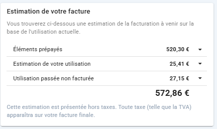 - Estimation de votre utilisation : il s’agit d’une estimation du montant total mensuel basée sur les habitudes d’utilisation actuelles observées jusqu’à aujourd’hui.